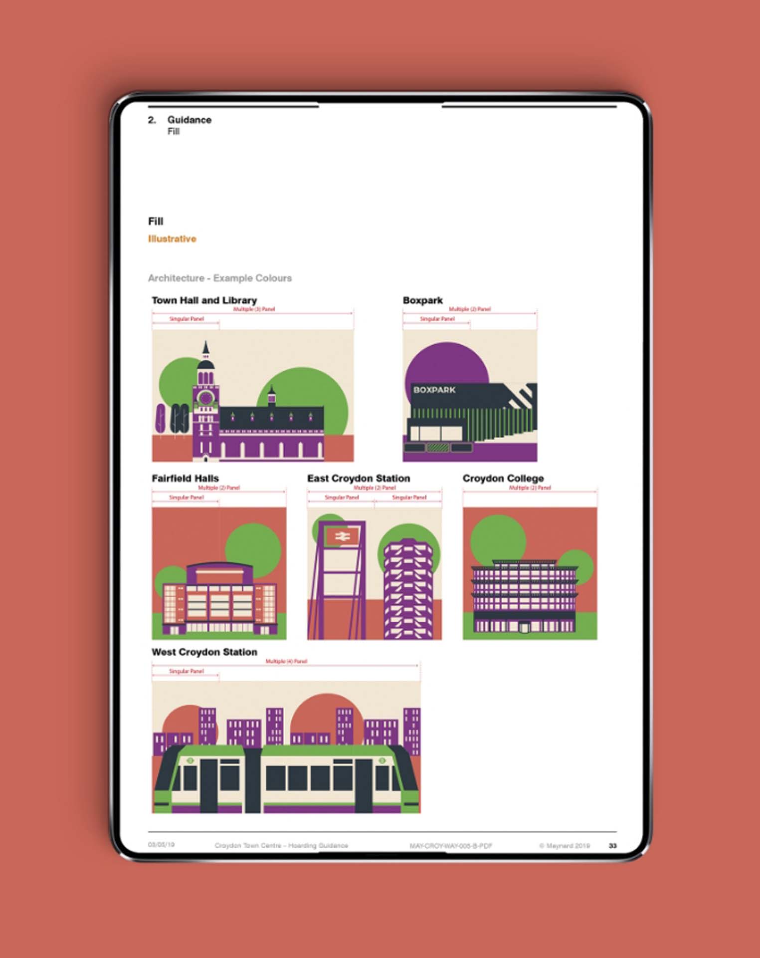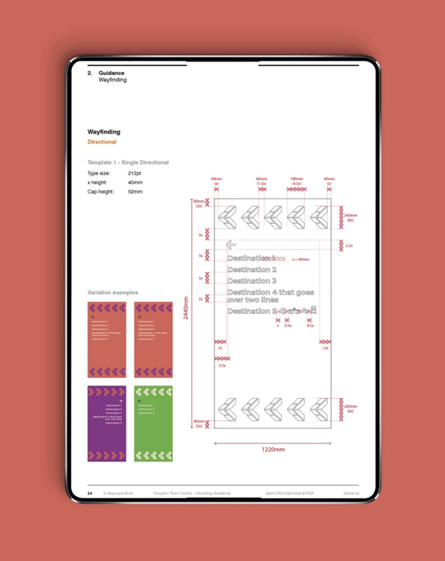 Maynard was commissioned by Croydon Council to review the current wayfinding provision and produce a long term strategy for wayfinding, including a plan for how to keep the town navigable during its transformation. Maynard’s overarching strategy continues to use Legible London as a trusted baseline for navigating Croydon, however we identified additional temporary measures to aid placemaking and wayfinding around construction sites which included utilising construction hoarding across sites owned by multiple developers.