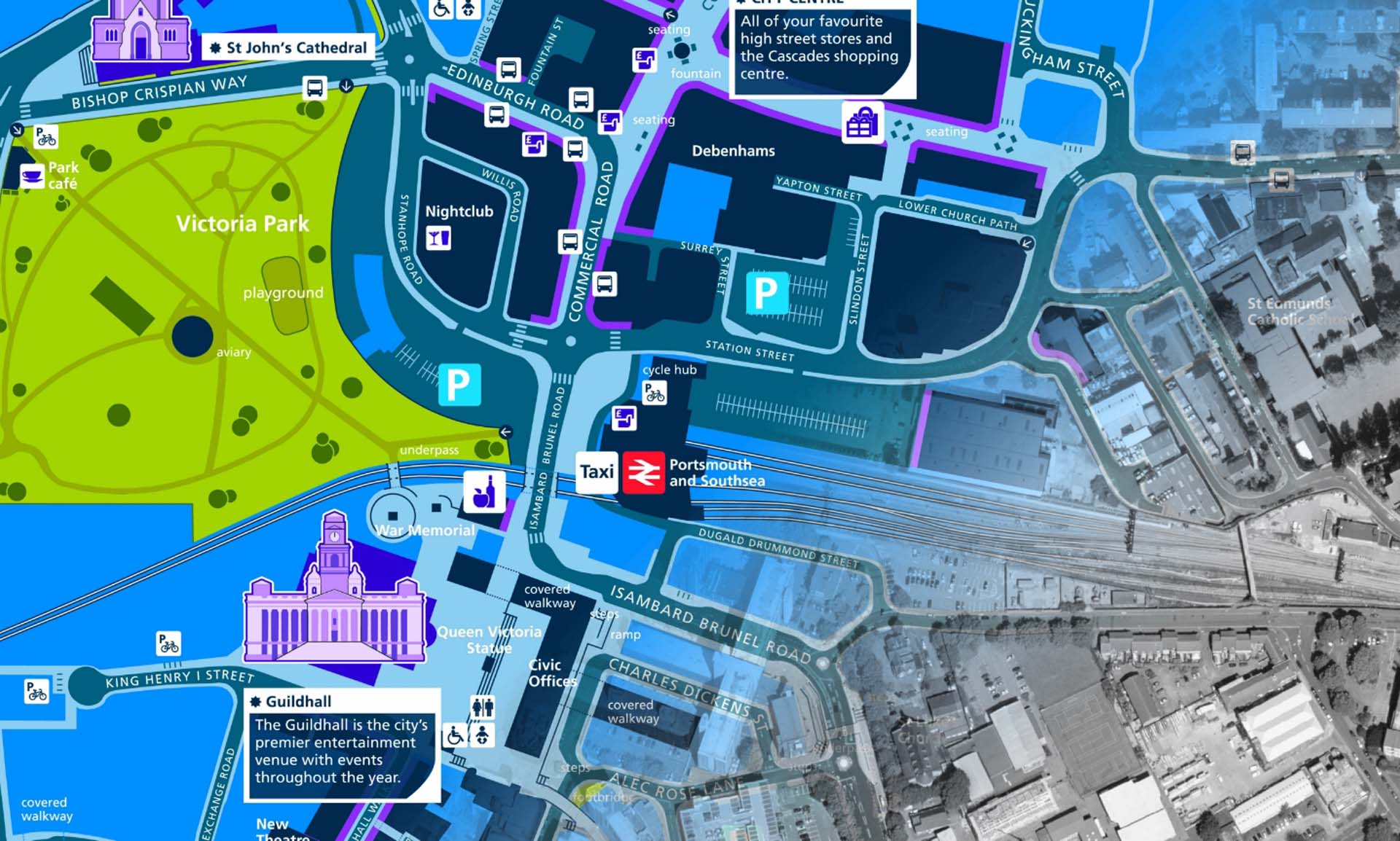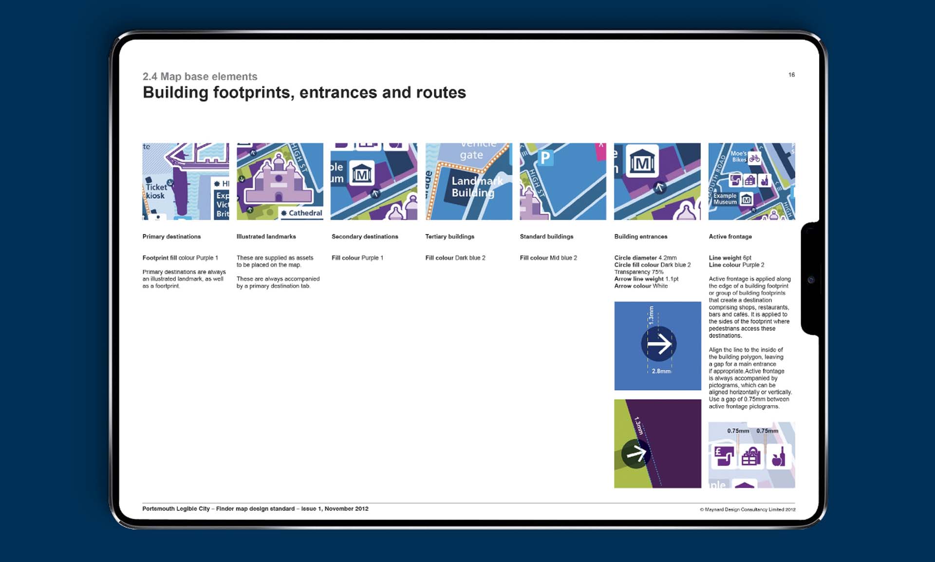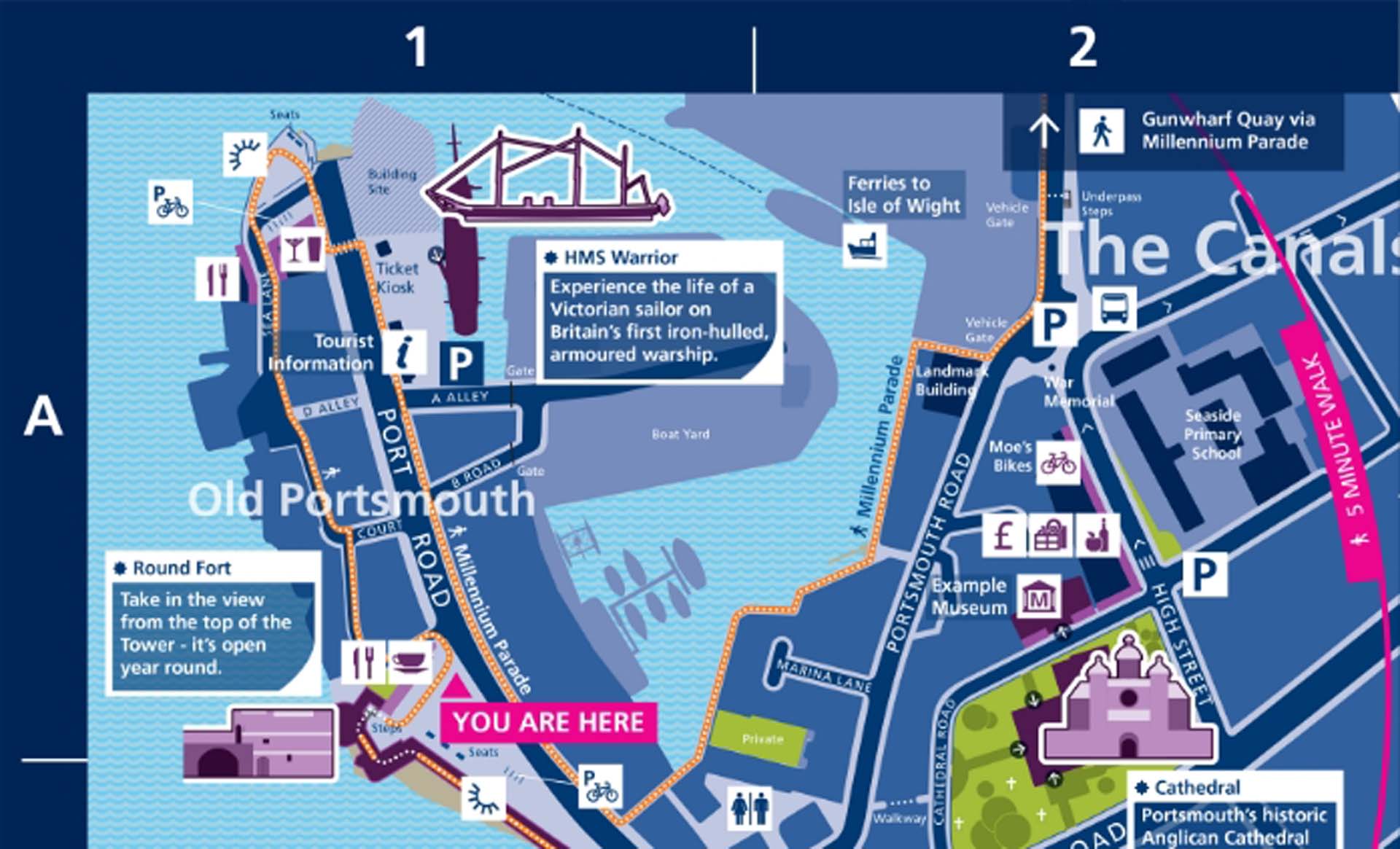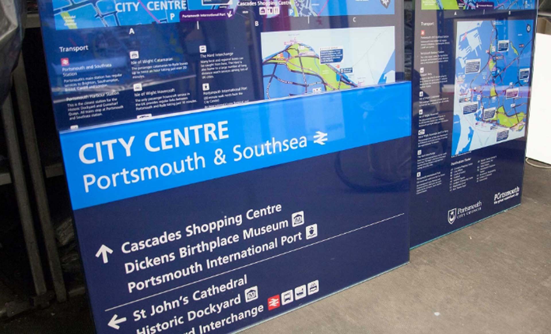 Portsmouth City Council commissioned Maynard to develop an integrated signage and mapping system that would work across a minimum of thirty wayfinding products in the city and the surrounding area. Detailed design standards were also produced so that the Council could update mapping panels.