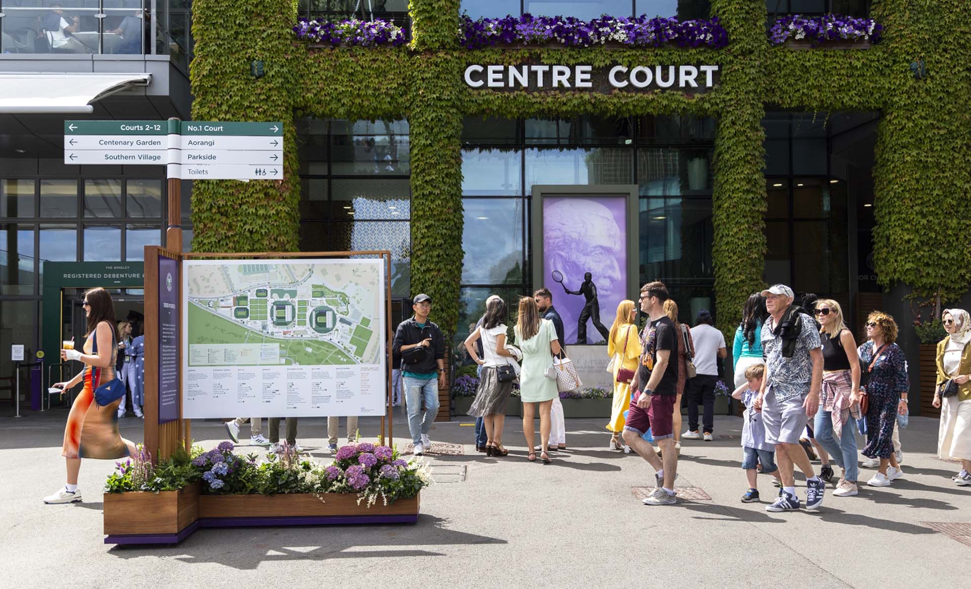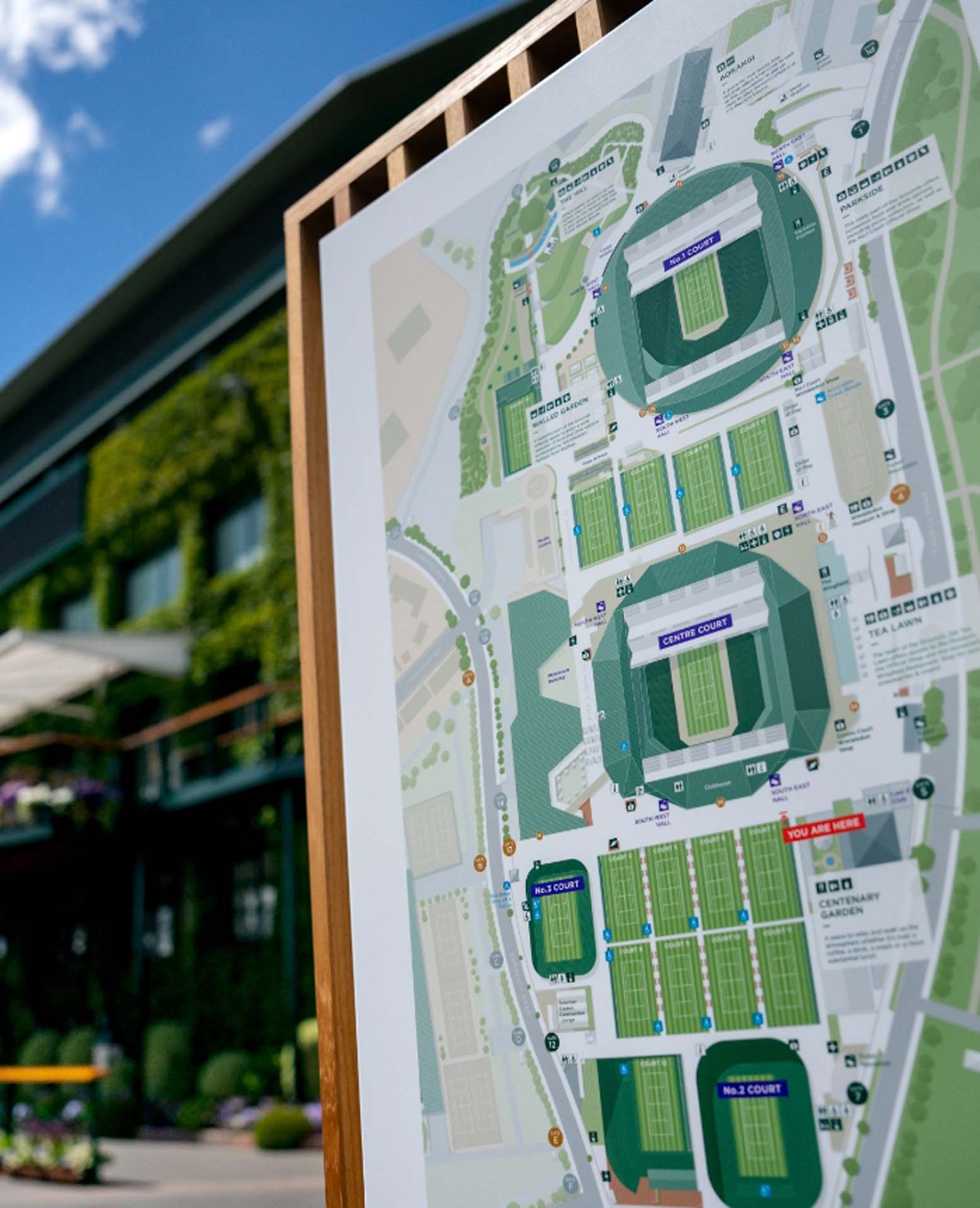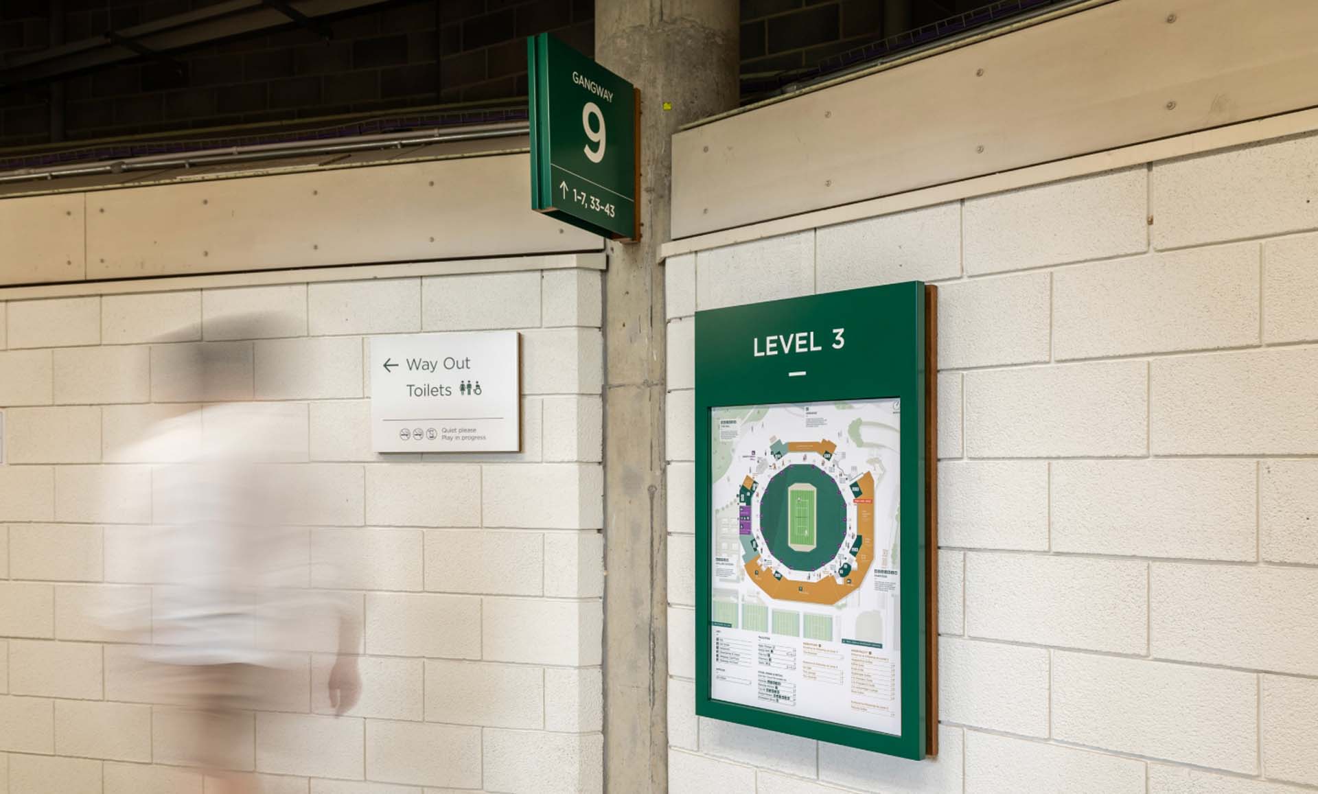 Maynard was subsequently tasked to develop a brand new wayfinding and signage system in time for The Championships 2022. This included new sign products, mapping and branded information graphics for Centre Court, arguably the most historic and famous tennis stadium in the world, and which itself celebrated its centenary in 2022. Over a condensed 9 month programme, the wayfinding system was conceived, tested and successfully implemented in time for the opening day.